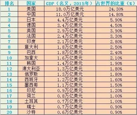 2017年公布的2015年全球各国GDP占比,数据图片来源:世界银行报告