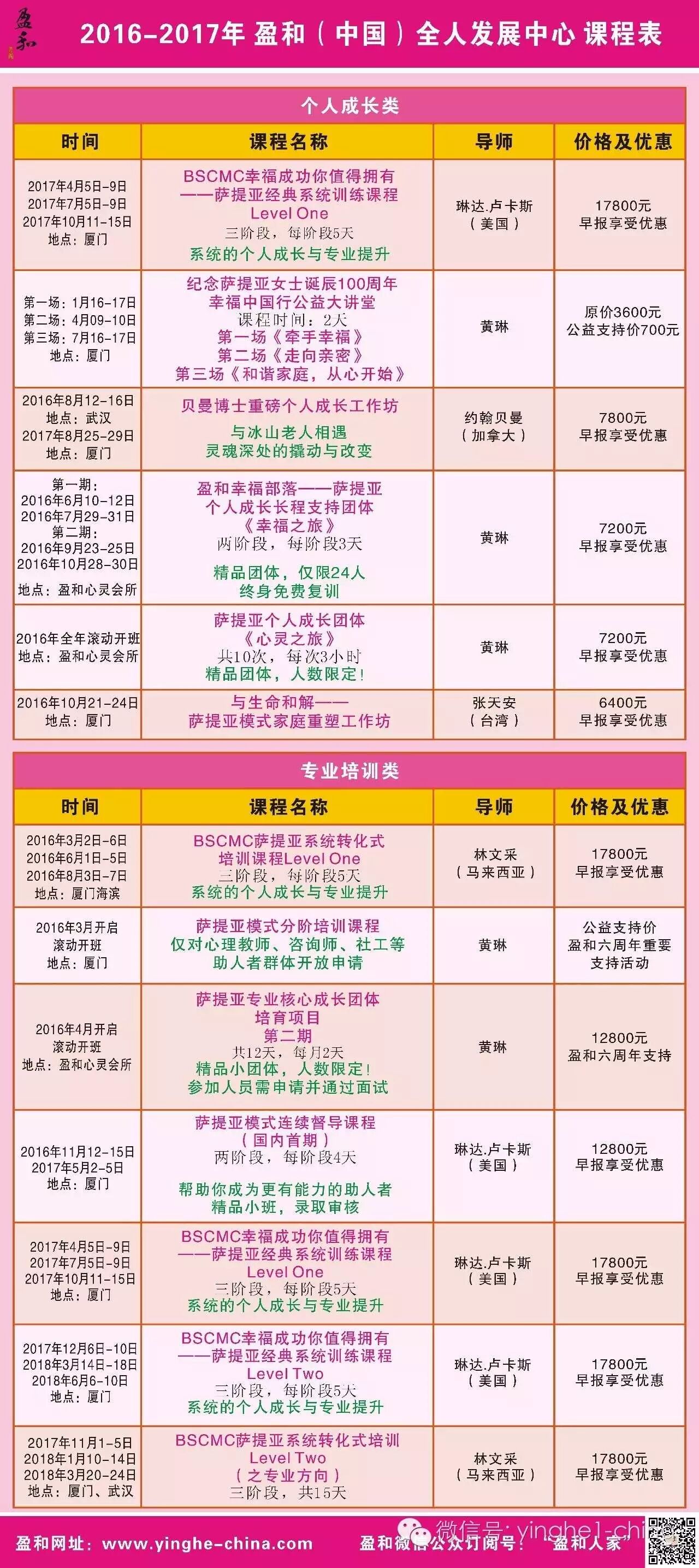 2016-2017年盈和萨提亚系列精彩课程,出炉啦!