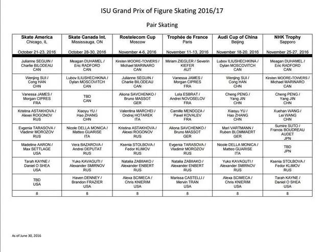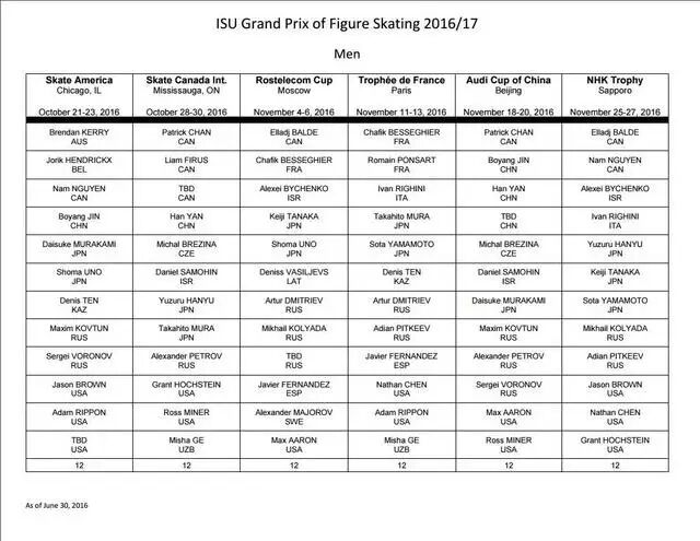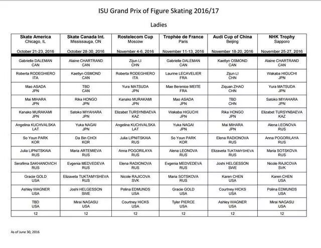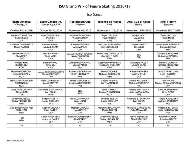 近日,国际滑冰联合会(ISU)公布了2016-2017世界花样滑冰大奖赛名单。根据ISU公布的消息,新赛季6站分站赛的比赛时间为:2016年10月21日-23日,美国站;2016年10月28日-30日,加拿大站;2016年11月4日-6日,俄罗斯站;2016年11月11日-13日,法国站;2016年11月18日-20日,中国杯;2016年11月25日-27日,日本站。其中男单方面,中国选手金博洋将参加美国站和中国杯的比赛,闫涵将参加加拿大站和中国杯的比赛。女单方面,李子君将参加俄罗斯站和中国杯,赵子荃将出战中国杯。双人滑方面,老搭档韩聪/隋文静将参加美国站、中国杯两站比赛,而重新搭配组合的于小雨/张昊和彭程/金洋两对组合也将亮相,其中于小雨/张昊将参加加拿大站、中国杯,彭程/金洋将参加中国杯和日本站。王雪涵/王磊则只参加日本站。冰舞方面,王诗玥/柳鑫宇参加加拿大站和中国杯、陈宏/赵研只参加中国杯。在六站分站赛的比赛中,中国杯星光闪耀,吸引了加拿大名将陈伟群、美国花滑美女选手瓦格纳、韩涩谷兄妹、加拿大组合维沃/波杰等世界名将的加入,豪华比赛阵容值得期待。关于总决赛的更多具体信息将在日本站比赛后公布,据ISU官网公布资料显示,总决赛的总奖金将达到27.2万美元。