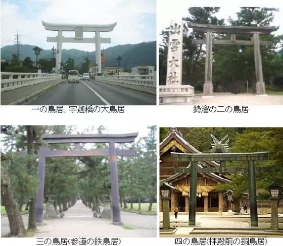出云大社有四个鸟居,因为在日语里,穿过四个鸟居与幸福的发音是一样(四逢わせ=幸せ),所以要想得到幸福和好运,最好是按顺序走一遍。四个鸟居各有特色,他们的建造材料是不同的,从第一个到第四个分别为石、木、铁、铜。