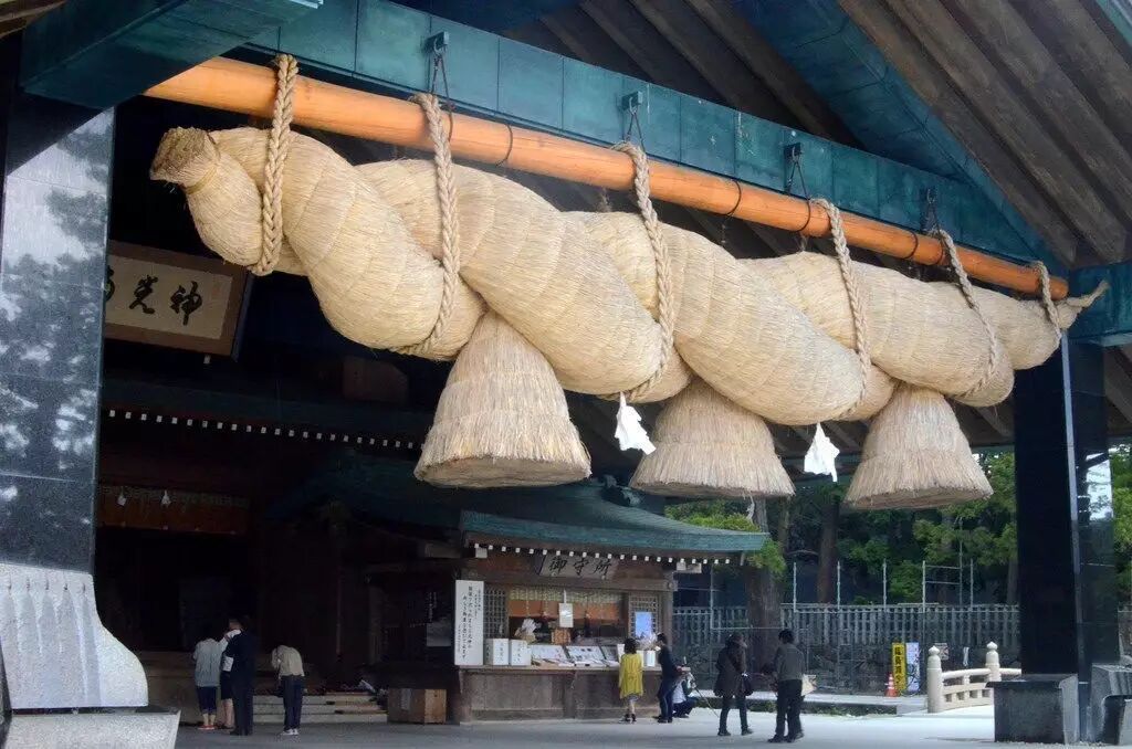 最后终于到了神乐殿,也就是大国主神被祭祀的地方,也是一般人参拜的地方。仪式与其他神社的二礼二拍手一礼不同,这里是二礼四拍手一礼(礼就是鞠躬)。在参拜的时候,内心要先告诉大神你的名字和住所,然后感谢,最后才说出自己的心愿。这里的大注连绳长达13米,重达4.5吨,是日本所有神社里最大的,也是出云大社的象征。(ps.经常有人向大注连绳扔硬币祈福,但据说这是对神极不礼貌的)