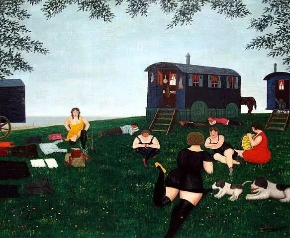 图为法国拙稚派画家Camille Bombois(1883-1970)的作品Le Repos Des Gens Du Cirque。画中描绘的是杂技演员在场地休息的景象。卸去取乐于观众的墨彩,在绿树的荫蔽下畅谈,身旁有狗,让自己质朴地与自然相遇……