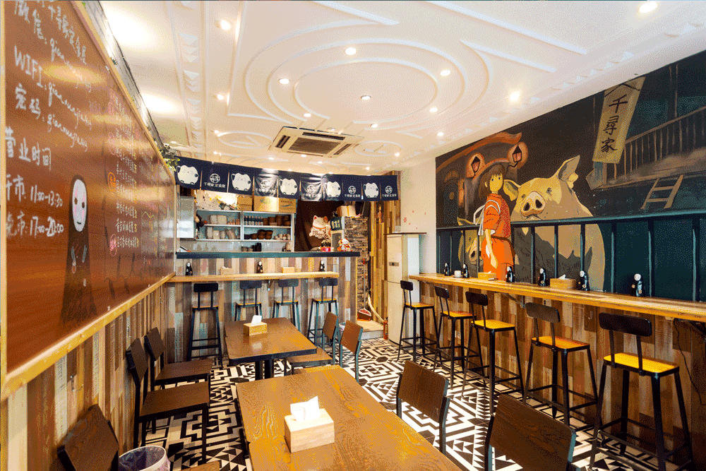 一进门就是一大幅千寻的彩画,底下有高脚椅,倚着靠墙桌整齐排列,木质的桌椅颇有几分日剧的气氛,照烧汁和猪排的味道弥漫四周,日系的帐幔垂坠,半遮半掩的挡住了后面的酱料,好像真的历尽凶险走进了汤婆婆的家。