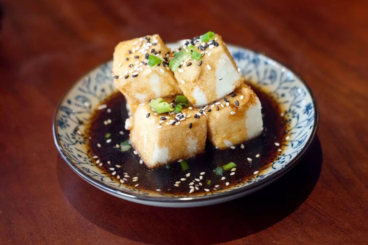 豆腐经过煎制,外壳焦香美味,内里吸足了汤汁的鲜味,上面有葱香缠绕,黑白芝麻点缀一二,外焦内嫩的豆腐沁味之后劲道耐嚼,内里柔软清香,过口难忘。