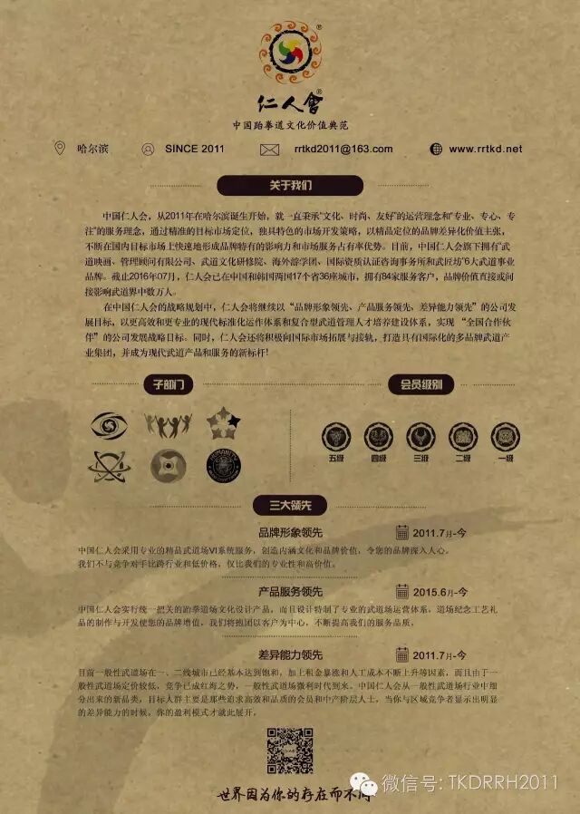 更多更好的跆拳道文化篇章第一时间会在仁人会官方微信服务平台和订阅微信上发布,敬请关注,收获甚多。我们的目的只有一个:做武士,不做武夫。跆拳道人应该是全能的社会型人才,应该得到更多的尊重。当我们懂得多了,操作起来也就更加娴熟,行业自然就越来越精,共荣也就不再是梦想。