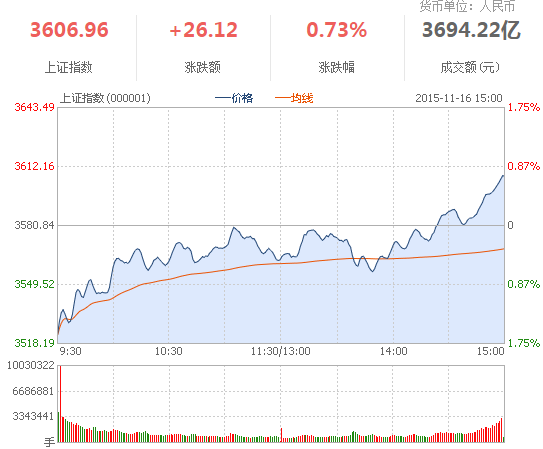 今日两市大幅低开后震荡上行,随后沪指维持震荡走势,深成指表现相对强势。午后,沪指震荡整理,创业板表现相对较强。13:50过后,两市强势上行,沪指重回3600点。截至收盘,沪指涨0.73%,报3606.96点,成交3694亿元;深成指涨1.76%,报12620.4点,成交5393亿元。