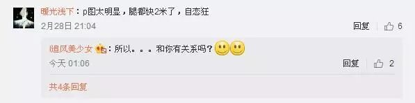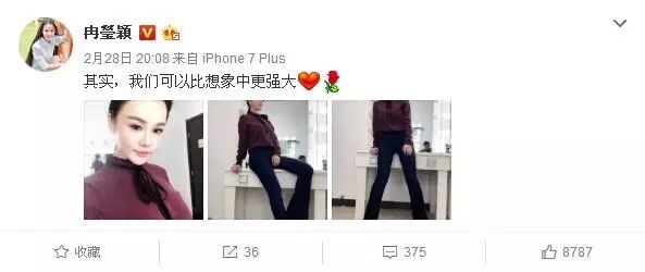 尽管如此,冉莹颖依然遭到了网友们的诟病,例如去年10月他曾与因出轨风波火遍全国的陈赫合影,引来百万人围观;此外她还与王宝强、刘德华等娱乐圈天王合照,更是获得了大量局外人的评论。近日,冉莹颖又在微博晒出了3张个人照片,并配文写到,“其实,我们可以比想象中更强大”。照片中的冉莹颖宛如少女一样清新脱俗,尤其醒目的大长腿简直美不胜收。看完这组照片后,网友们再次纷纷发表感慨,其中有一位网友质疑冉莹颖又P图了,“P图太明显,腿都快2米了,自恋狂”,而其他网友更多的是力挺,“这大长腿没谁了”、“这身材,流鼻血”、“今晚见到你本人,脸好小好漂亮的”、“好长的腿”、“你若安好,便是晴天”。