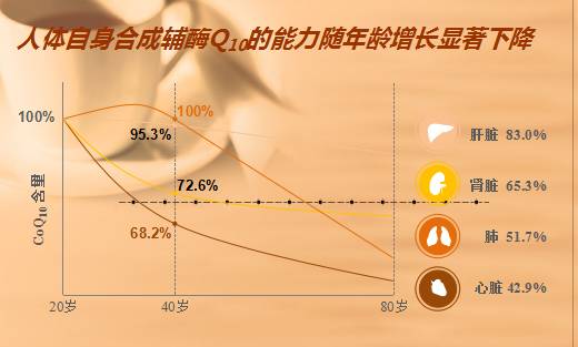 人体可以合成辅酶Q10,这个过程需要几十种维生素和矿物质以及酶,而随着年龄的增长,体内合成辅酶Q10的能力逐渐下降。45岁后,体内Q10的数量急剧减少,特别是心脏,减少的更多,因此随着年龄的增长,心脏病患者急剧增加。人体也可以从食物中获得辅酶Q10,然而这个数量是非常少的,不足以满足人体的需要,特别是已经有心脏病的人,需要更多的辅酶Q10.