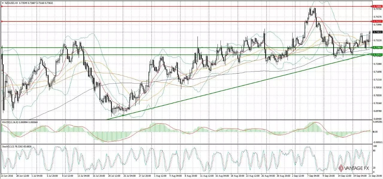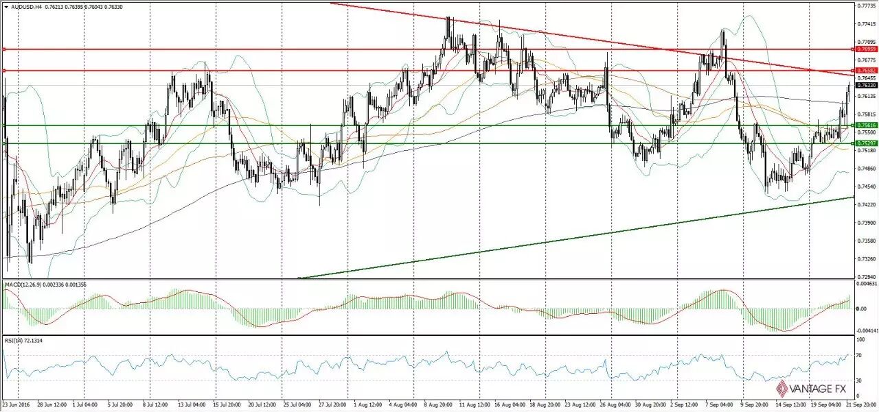 在昨日美联储按兵不动的情况下,市场再次恢复到追捧收益率的阶段,澳元也成功完成从底部的反弹,延续了我们认为的中期上涨形态。现在的走势再次接近0.7660一带的长期下降阻力线位置,今明两天如能突破将打破这一从2013年起的下降轨道,更上方澳元的阻力在0.77。下方的支撑也有所上移,0.7560以及0.7530的位置。