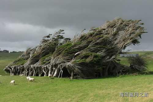 3.新西兰一处风吹树斜奇景:刚好生长在新西兰南端的边坡上,不断受到大风劲吹,却又能坚持生长。