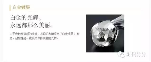 由于会触及敏感的皮肤,滚轮的表面采用了白金镀层。耐热、耐酸性强,能长久保持美丽的光辉。