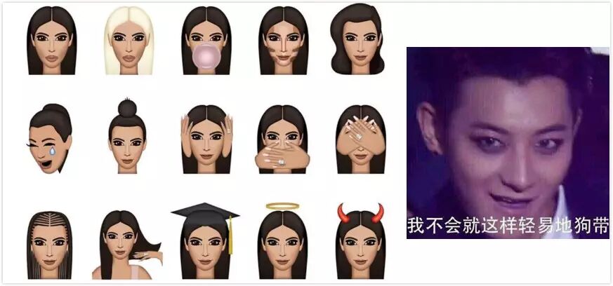 表情届流派分明,欧美地区对于 emoji 表情使用得乐此不疲,连明星红人如金•卡戴珊都要推出自己的 kimoji 表情。虽然金大姐的表情也被美国人民花样恶搞,但是和中国明星的表情包比起来还是小巫见大巫。