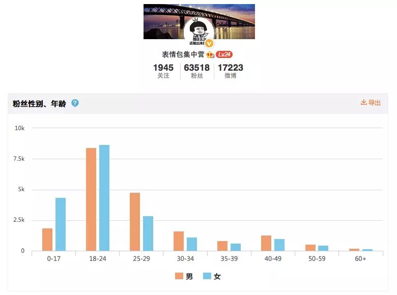 从上图微博表情包相关账号后台统计图也可看出,18-24 岁的年轻人是表情的使用主力,17 岁以下少女对于表情包的需求远超出同龄男性,不过在 25 岁年龄段之后男性对于表情的需求却反超了女性。