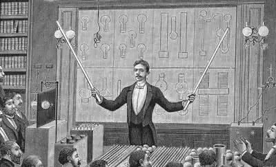 与爱迪生不同,特斯拉直接在自己身上做实验,以证明交流电并不是洪水猛兽: