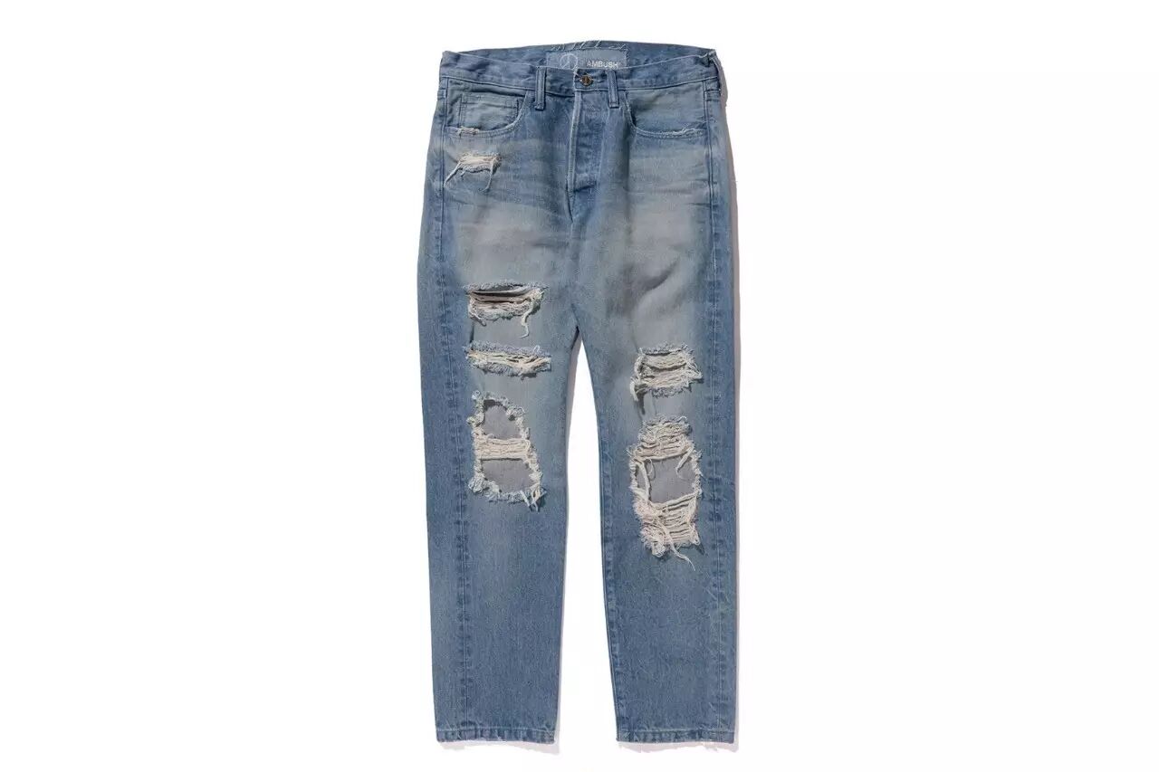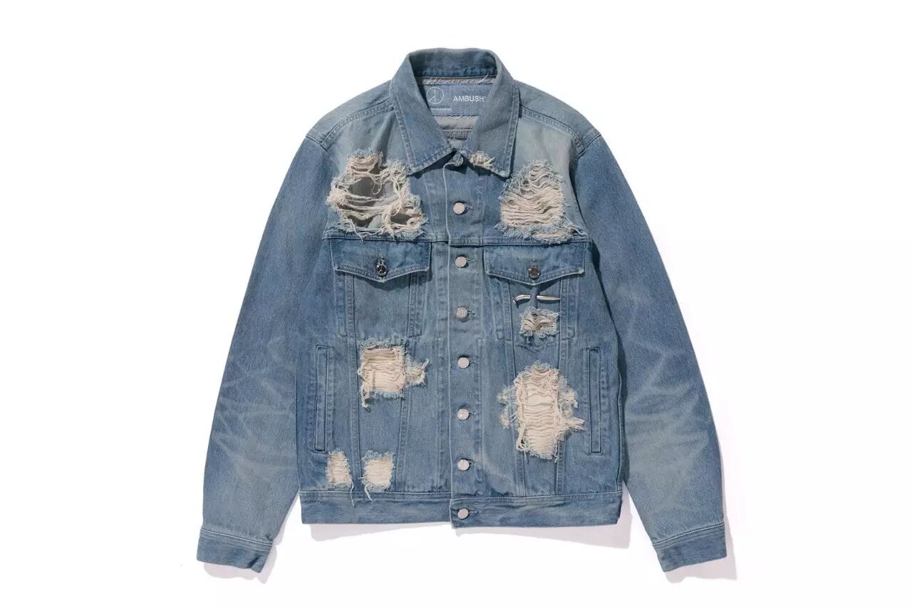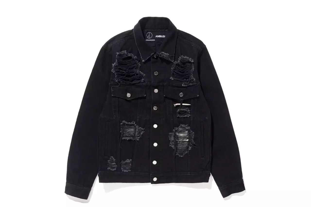 至于设计方面,新系列主要围绕「Denim」主题出发,打造了丹宁外套、丹宁裤和 T-Shirt 三款设计。其中丹宁外套和裤子分为普通版和「破洞」版,顾名思义,后者采用了更具视觉张力的破坏处理,钮扣上则是 PEACEMINUSONE 的经典 Logo,更于细节处设有一根弯曲的银制「洋钉」作装饰,单品增加了不少 Punk 气息。至于黑、白两件 T-Shirt 则简单印上了手绘版 Logo 表明身分。