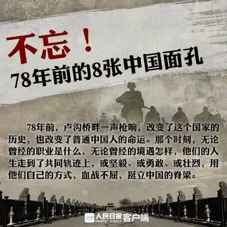 78年前的今天,卢沟桥上的枪声,拉开抗日战争的序幕。8年浴血奋战,中国军民伤亡超过3500万,大半个中国山河破碎,生灵涂炭。卢沟桥上的硝烟已经散去,有的人想忘记,所以我们必须牢记。今年,,发条微信,祭奠遇难同胞。也提醒:正义不容亵渎,历史不会重演!