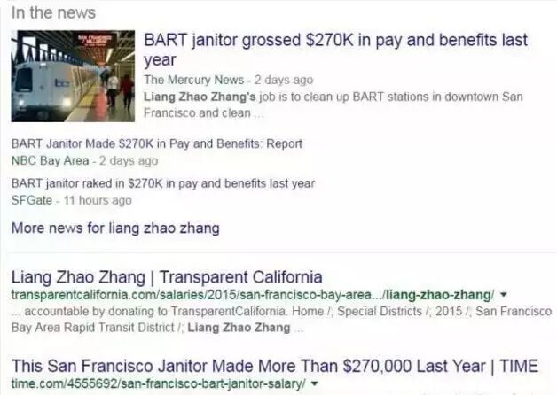 这位清洁工名叫Liang Zhao Zhang(张良朝,音译),靠打扫旧金山市区BART(地铁)沿线的站台,在2015年赚了27.1243万美元(约合人民币182.5万元!)!而且,不只是今年,过去三年,他的薪金总数就已经达到68万美元了!