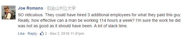 “太扯了!这么高的加班费都够再招3个人了。而且,他每周工作114个小时,效率能有多高?他的工作质量一定不达标,只是在拖时间。”
