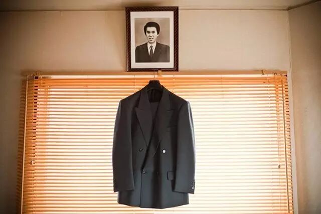 比如上图遗照里的寺西晃先生,曾经营一家连锁餐厅,连续10年每天工作12-14小时,因劳累过度患上抑郁症,最终在一个下雪的情人节跳楼。他的妻子在家中挂了这件西服,以示纪念。