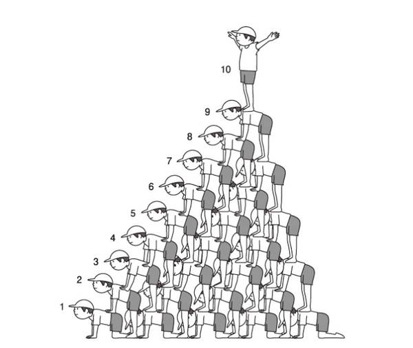 体育课上,传统的日式叠罗汉“人体金字塔”是必备的项目。叠罗汉需要极强的耐力、体力,最高叠到10层,超过7米。最底层的角色需要体力好的学生担当,负荷量可能达到200斤。这对于身体还没有发育完全的小学生是一种极大的挑战,骨折、脱臼之类的受伤如家常便饭。