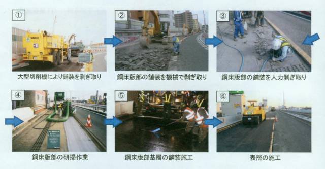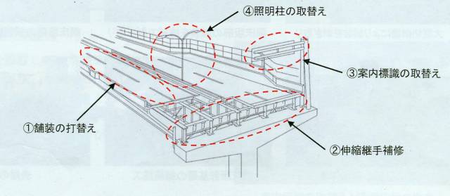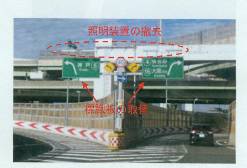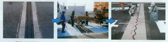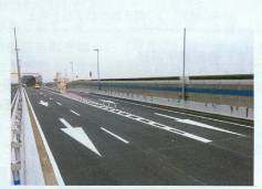 5号沿海线(南港~北港JCT)自1991年交付使用以后,已经过约24年,铺设路面的损坏多有发生。因此,要重铺损坏的路面,改善行驶性。以往都是局部维修,而这次是大范围大规模的维修,因此整体质量也将得到提升,不容易产生坑洼,能够减少紧急维修工程的次数。在重铺发生疲劳龟裂的钢板部位时,将铺设的路面基层(下层)更换为SFRC(钢纤维加劲混凝土)。通过更换为刚性高的SFRC路面,提高钢板路面的耐久性。于损坏严重的伸缩接头,将其更换为不易产生段差的新型伸缩接头。通过更换伸缩接头,从而确保路面平坦性,实现舒适行驶性和改善沿路环境。将安装有照明装置的传统标志板更换为采用超高亮度反射板的标志板。它提高了夜间可视性,同时不再需要象以前那样对照明装置进行维护检查以及更换灯泡,能够减少车道管制工程。道路照明更换为LED,寿命比传统照明长,实现了节能。另外,灯泡的更换频次减少,从而能够减少车道管制工程。LED为白色,提高了可视性。通过换成刚性高的电杆,提高电杆抗震性。近年来,从出入口处逆向行驶和错误驶入的情况呈增加趋势,作为对策,实施以下措施:在汇流处的路面上设置箭头,指明行进方向。