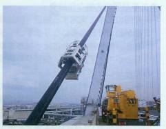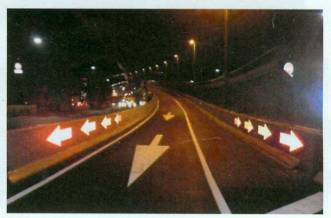路面设置两个大型箭头路面标志,在道路侧面设置高亮度反射板,以防止夜间错误驶入。以前采用高空作业车检查的方法,难以接近钢索上方进行检查。而使用钢索检查机器人进行检查,可通过高品质图像相机拍摄钢索全长来进行检查。用“发现君 K”从铺设路面上进行检查,以掌握钢板铺面的疲劳龟裂发生情况。在沿海线常用的钢制伸缩设备(指形伸缩缝)中,有时会从指形伸缩缝的下面损坏甚至断裂,而伸缩缝下面的损坏情况无法从路面上掌握。因此采用超声波探伤技术进行无损检查,以掌握指形伸缩缝下面的损坏情况。