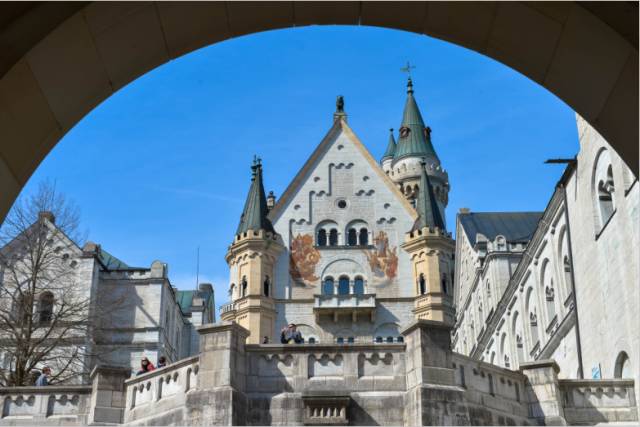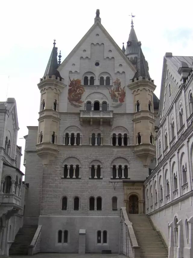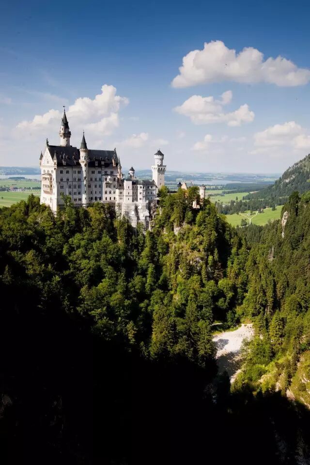 新天鹅堡是19世纪晚期的建筑,位于德国巴伐利亚西南方。这座白色城堡耸立在高高的山上,四周环山和湖泊。