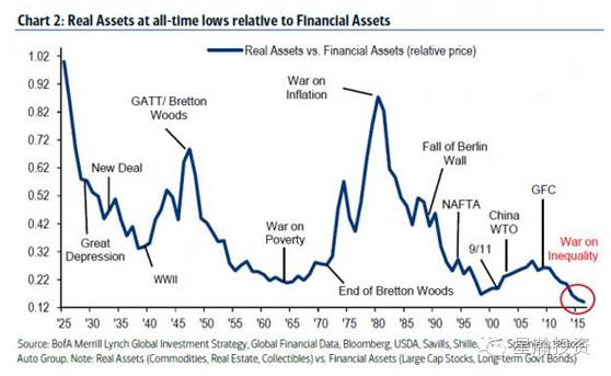 美元指数在15年连续2次触及100,而在16年底再次突破100。或许很多人会认为金融危机将再现(在过去20年,美元指数接近或超过100时全球发生过数次金融危机:、东南亚金融危机、欧债危机等)。但我认为这一次不一定会有大规模的区域性的实体经济危机。首先,这一次不是区域性的危机而是全球化的危机,其次,全球实体经济在08年之后一直很萧条,一直都在底部,并没有继续爆发更严重萧条的空间。我认为真正的危机在于:金融系统。央行08年之后释放的过多流动性大多数没有集中在实体,而留在金融体系。全球金融和实体的比已经史无前例的高(特别的,中国的金融占比已超过美国了)。下图为与金融占实体的比重(史无前例):