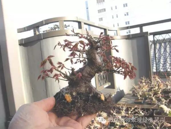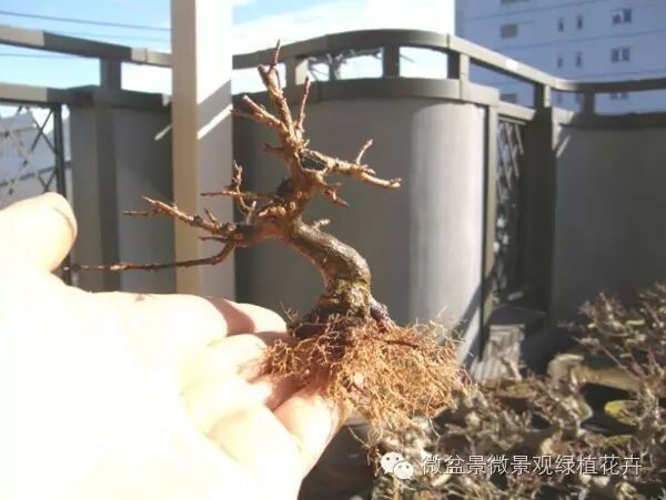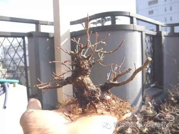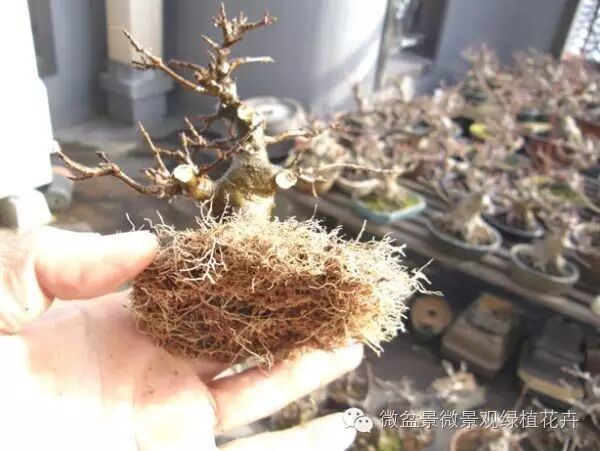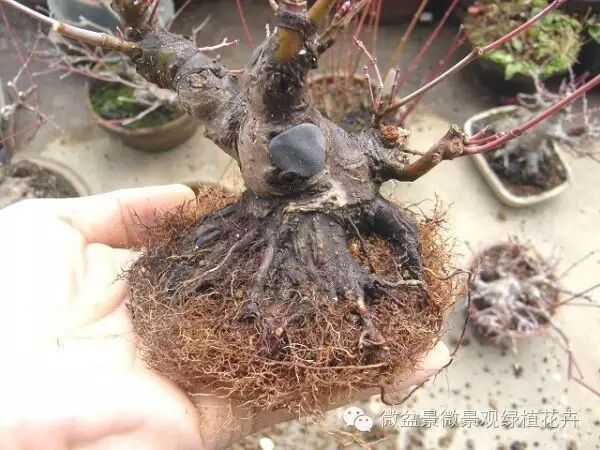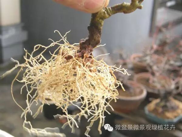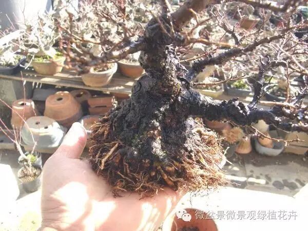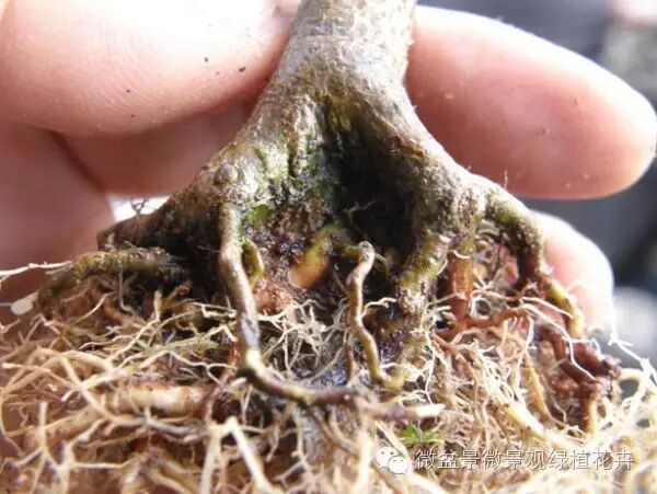 日本盆景玩家对根盘的培育十分重视,在素烧盆养坯阶段利用每年换盆时机,对根系不断截强留弱,盆面下基本看不到突兀的粗根,而是被毛细根所取代。好根盘表现在根粗细过渡有序、毛细根稠密发达、八方根分布均匀、根盘形状完整而形薄,树木成长主要靠毛细根吸收水份、养份,根系健康与否直接关系到树木生长。我国盆景爱好者往往比较注重树形而常常忽略对根系的栽培,粗根还没过渡到毛细根便急于截根上观赏盆,这对植物生长不利。