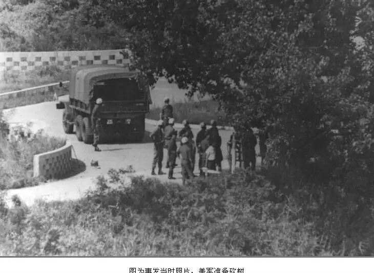 事件起因是美军在“共同警备区”(韩方一侧),希望砍掉一棵挡了联军第5观测站和朝军第3观测站之间的白杨树。砍树行动事先于1976年8月6日停战委员会会议上向朝方做了通报。