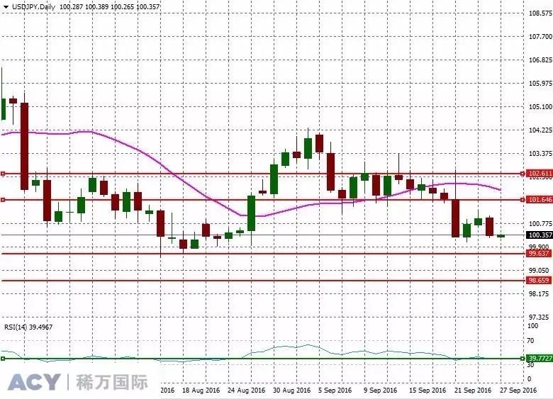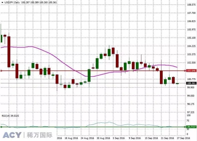 本周二 (9月27日)亚市盘中,美元/日元低位走高,目前汇价交投于100.36一线附近。昨日美元/日元大幅下滑,因市场不确定性。技术面上,日线图上看,汇价维持在20日均线附近下方运行,RSI(14)相对强弱指标位于50均衡位置附近下方,显示短期价格力度整体趋势震荡偏弱。目前较近上方阻力位于101.64附近。如图一:![]()
