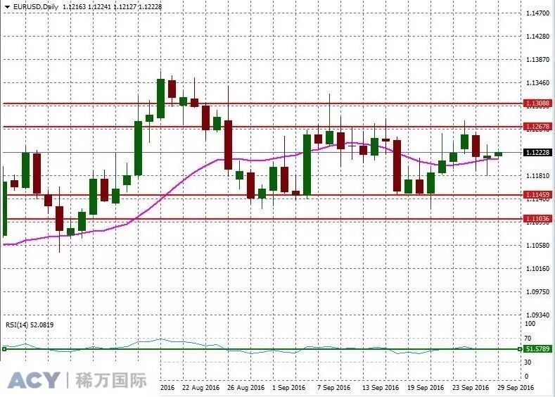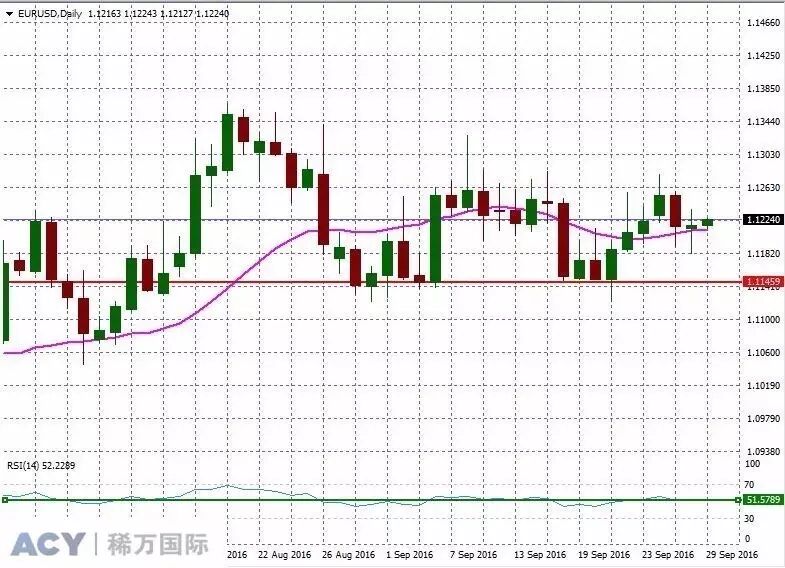 本周四(9月29日)亚市盘中,欧元/美元微幅上行,目前汇价交投于1.1234一线附近,昨日欧元/美元微幅上行,欧元汇率波幅料趋于缩减。技术面,日线图显示,汇价维持在20日均线上方,RSI(14)均衡趋势指数位于50附近上方,显示短线价格趋势偏强。技术面就近下方支撑位于1.1145位置附近。如图一:![]()