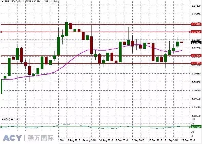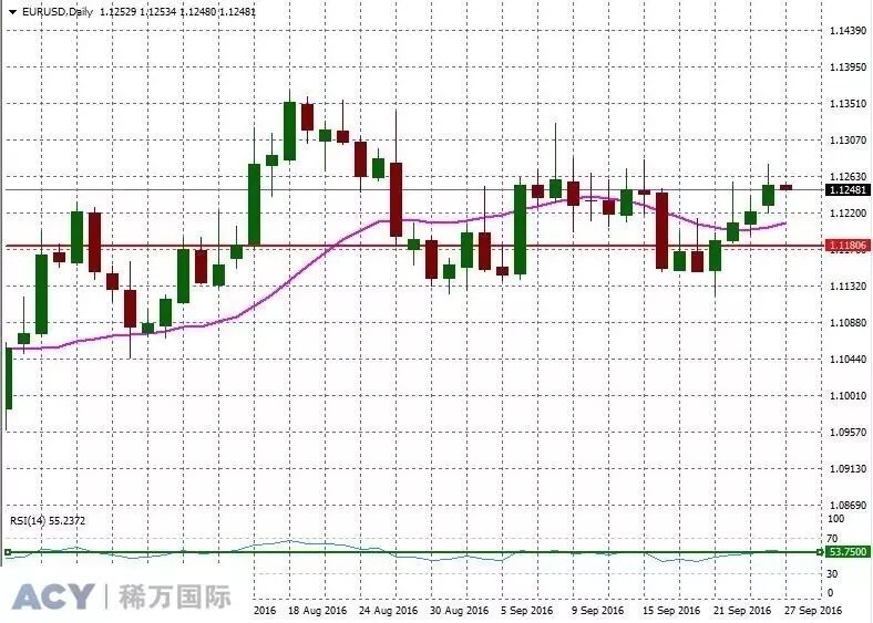 本周二(9月27日)亚市盘中,欧元/美元微幅下滑,目前汇价交投于1.1248一线附近,昨日欧元/美元小幅上行,因欧元依旧强势。技术面,日线图显示,汇价维持在20日均线上方,RSI(14)均衡趋势指数位于50附近上方,显示短线价格趋势偏多。技术面就近下方支撑位于1.1180位置附近。如图一:![]()