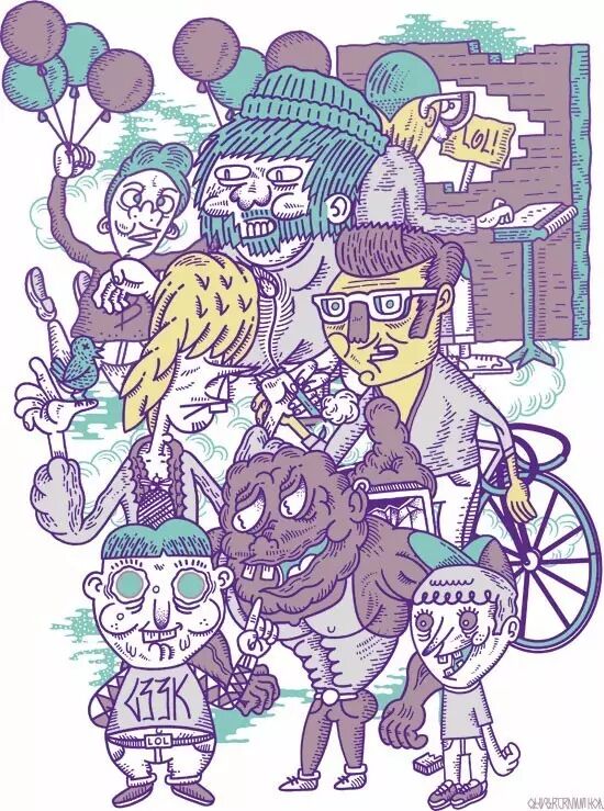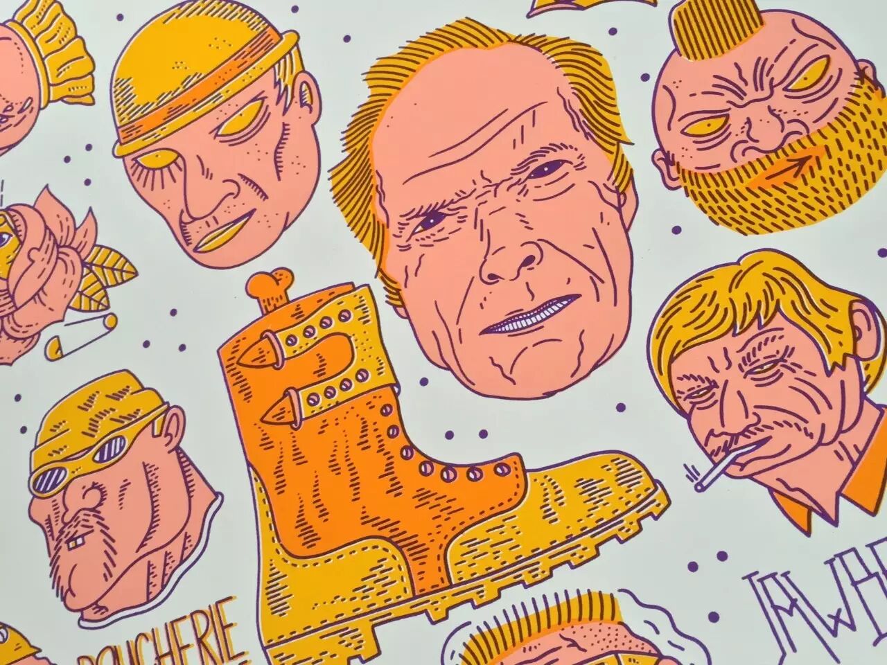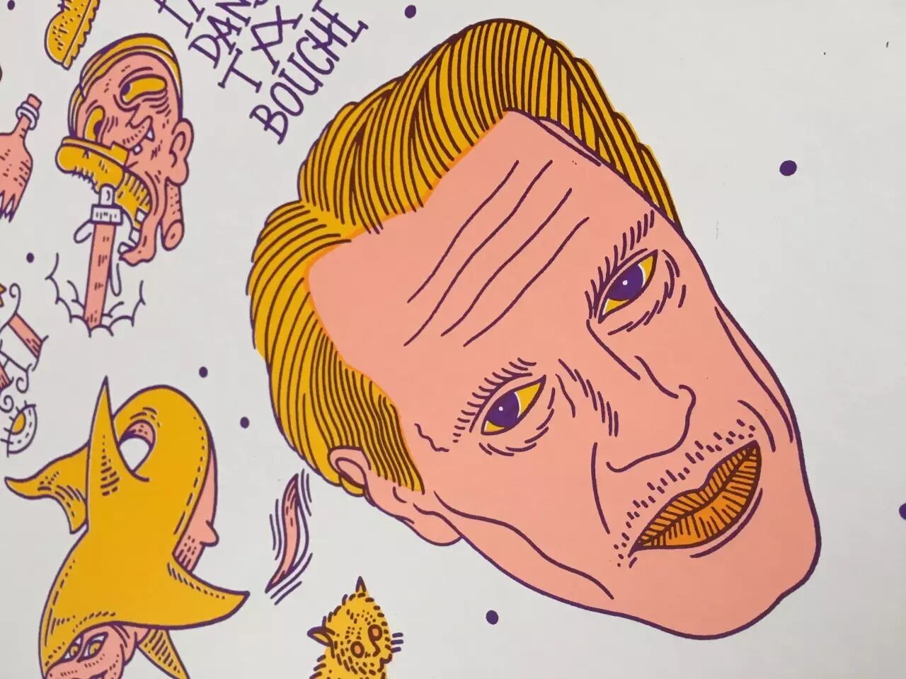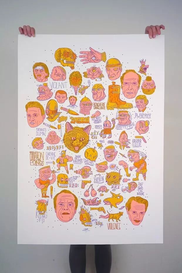向大家特别介绍两幅出自 Olivier <<Koa>> Cramm 之手画风迥异的丝印作品,都是由法国 FrenchFourch 团队丝网印制出品。第一幅作品被归纳在丝印团队 Bastonnade 系列之中。其中主要元素取自 Olivier 的肖像系列插画,不妨仔细看一看:里面画的人物形象你能猜到都是谁吗?