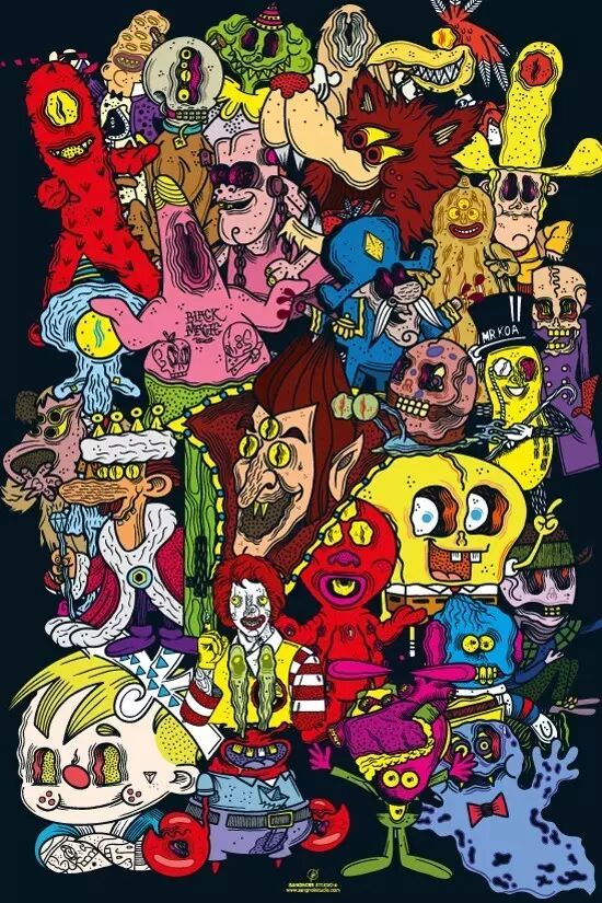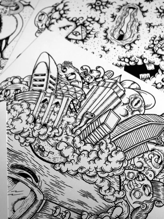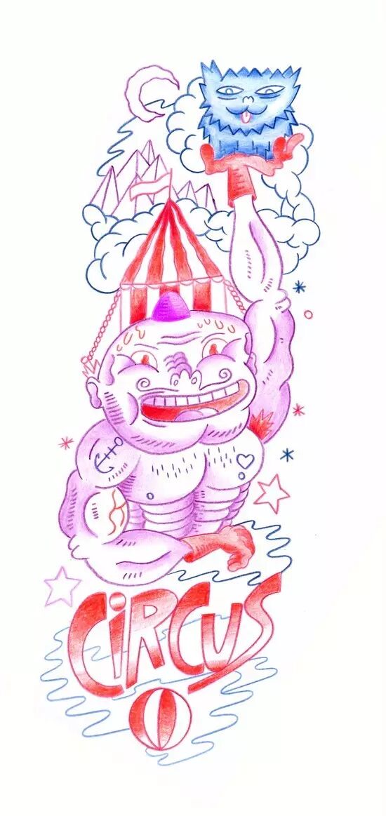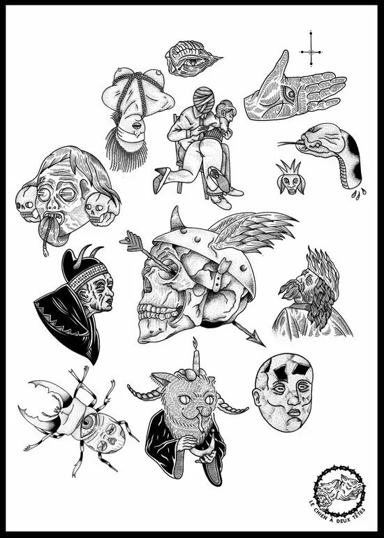 Olivier's art work is a universe of happy and colorful oppressive chaos where monsters are masters and humans are slaves. Monsters fascinate him since he is a little kid. His universe is full of religious symbols, occult symbols, tattoos...