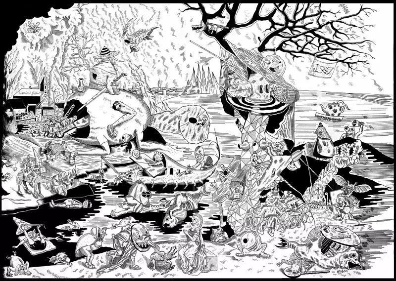 His world may seem dark but it s not. It would be rather silly. Sometimes juggling with references such as Dürer and Bosch, sometimes using very bright colors of 70s comic books. Olivier has created his universe since years, at once sultry, poetic, funny, strange... His forthcoming book Sang Noir should be released later this year.