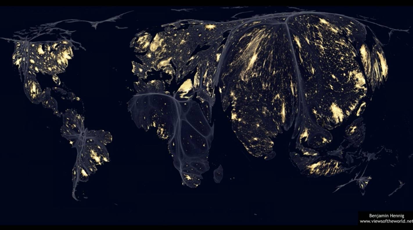 我们也知道现在一些事情做的非常糟糕。你以前一定看过这张世界地图。这是由卫星图像制作的地图。你所熟知的全球灯光分布图显示了人们生活的地方,但在这里,我们将它拉伸。在这个地图上到处都有相同的人密度。如果一个区域没有人,我们就缩小它使它消失。所以我们显示每个人的同等重要性。现在,灯光不再显示你的人在哪里,因为人们无处不在。现在地图上的灯,伦敦的灯,开罗的灯,东京的灯,在美国东海岸的灯光,灯光显示出那儿的人的富裕程度,他们能花得起钱供电灯照到天空能如此挥霍,所以卫星可以得出一个这样的形象。在地图上黑暗的区域要么是人们无法接触到太多能量的区域,要么是人们所处的区域,但他们已经学会了停止将光照向天空。如果我能给你看这个地图,随着时间的推移,你会看到,东京实际上变得更暗,因为自从海啸席卷日本后,日方将核电站关闭了。