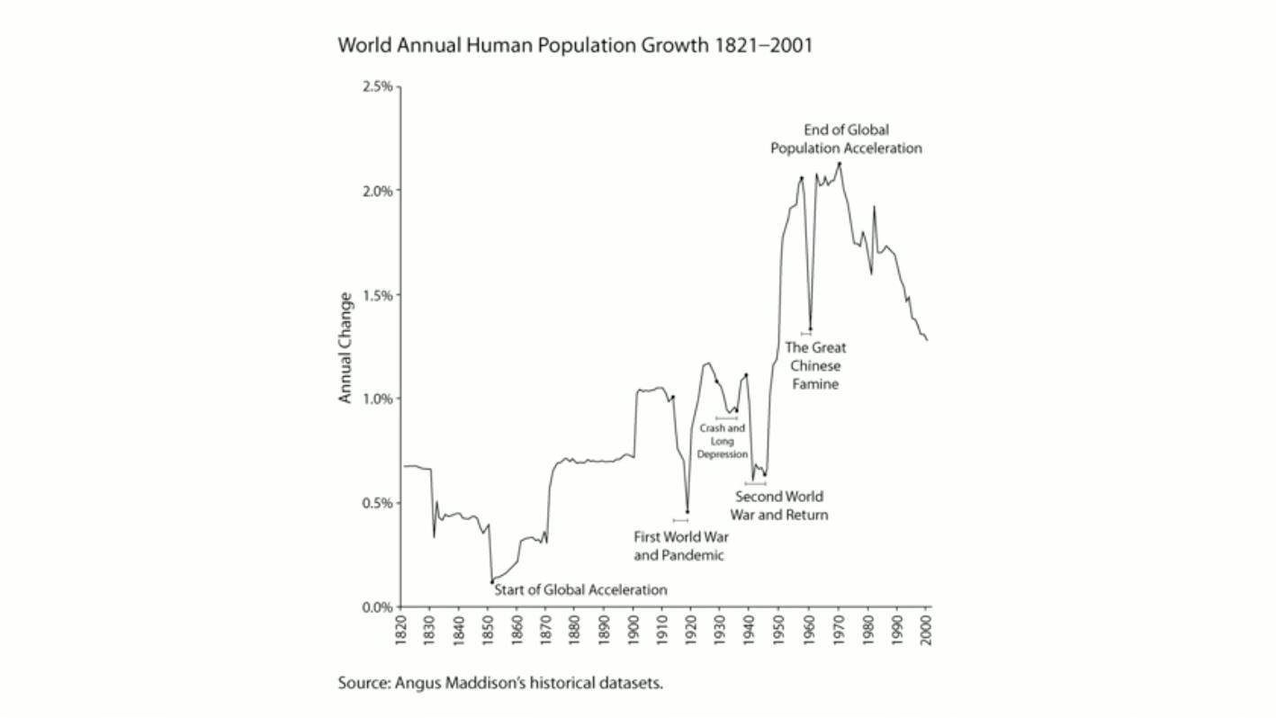 这张图表显示了世界人口年增长率。直到大约1850年左右,人口增长率才开始上升,所以在我出生的时候,当我们第一次看到月球上瞭望的地球的图像时,全球人口增长率接近2%。如果它在几个世纪以来每年都持续两个百分点的增长,整个地球将是人山人海、摩肩接踵。1968年“人口炸弹”的概念瘟疫般传播,人们心中忧心忡忡。但是,在图表的尽头,增长开始放缓。七十年代,八十年代,九十年代,我们的人口增长正在放缓。到本世纪末,我们的星球正在稳定下来。一路上,你可以看到各种动乱。你可以看到第二次世界大战。你可以看到在1918年爆发的流行性感冒。你可以看到悲壮的中国大饥荒。这些事件都值得我们的关注。
