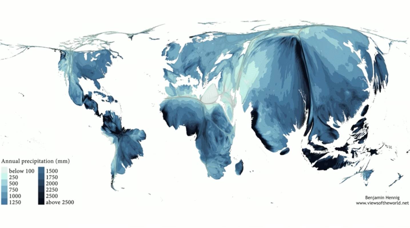 这张图显示了全球降水的分布状况。你可以看到有很多人生活在水很少的地区。你也可以看到有大量降雨的区域。还有一些地方情况更为复杂。你可以看到季风在地球上移动,这个星球有它的心跳。有了水才有生命。