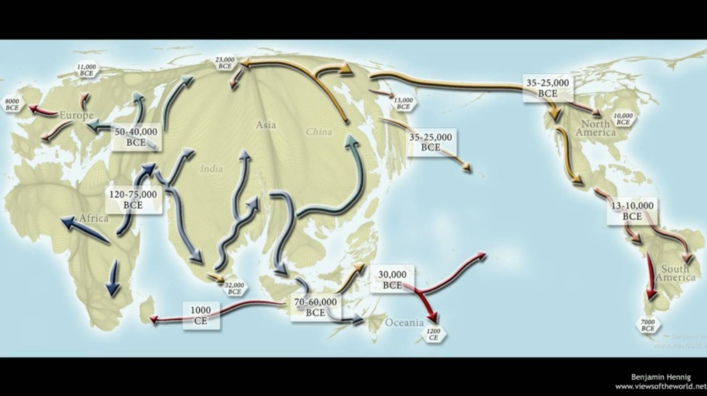 这又是一张世界地图,但在这个地图上,箭头显示了人类如何从非洲发源,然后向世界各地散播。图上的日期显示了我们认为人类在到达那里最早的时间。我每几个月都要重绘这张地图,因为不断会有人更新某个特定的数据。我们以惊人的速度学习人类本身。我们正在发生改变。很多变化是渐进的。我们没有注意到这些变化,因为我们只有短暂的七八十年的寿命,如果你够幸运,那也仅仅是九十年。
