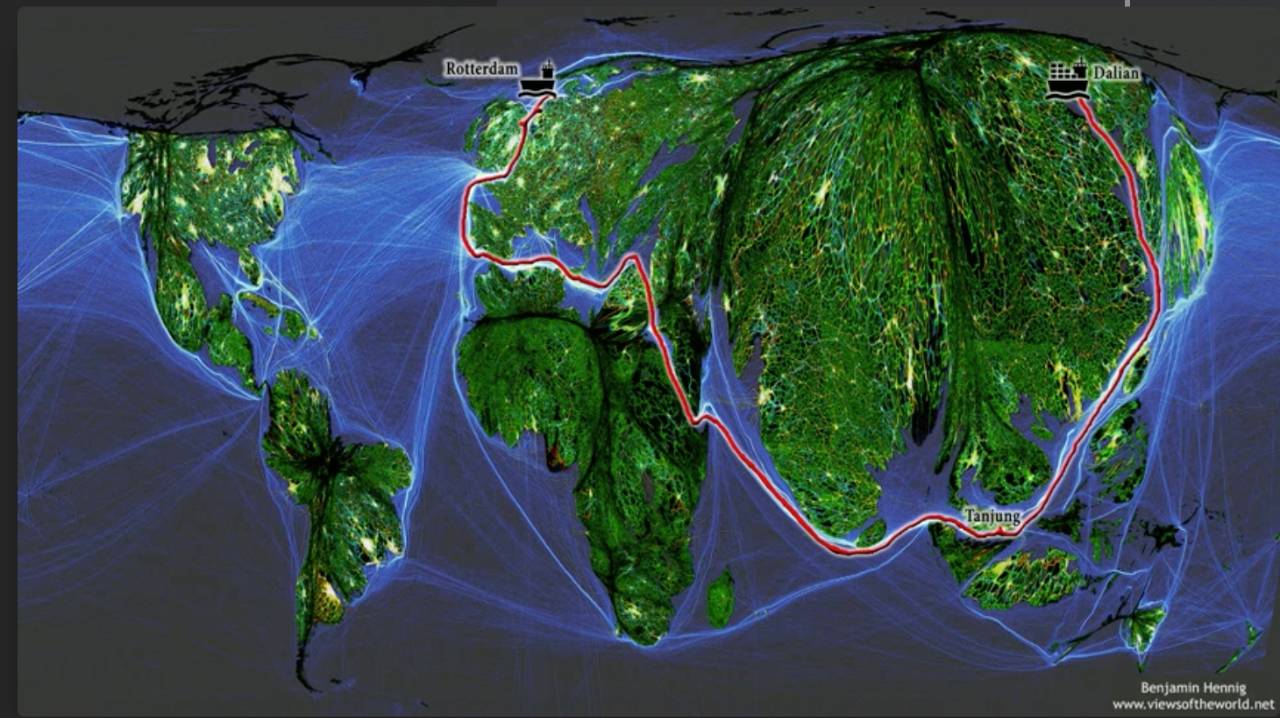 这是张世界地图,但它看起来有点奇怪。它受到了一定的拉伸,让那些人口更为密集的地方变得更大,而几乎没有人的撒哈拉沙漠和喜马拉雅山区缩小了许多。这张图上,地球上的每个人都有相等的空间。同时通过人工着色我们使得城市显得更为明亮,线条则显示人类的海底电缆和贸易路线。还有一条特别的路线是从中国的大连港经过新加坡,经过苏伊士运河,穿过地中海,最后到鹿特丹。它展示了一年前世界上最大的船只的航行路线。一艘正装载着如此之多集装箱的船舶的货物,若卸载时,全部装入货车,那么车队将会有100公里长。正式通过这样的贸易体系,世界紧密相连。