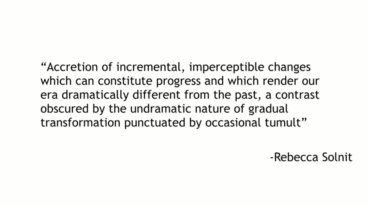 世界上也有很多好消息。婴儿死亡率正在下降,并且是以惊人的速度下降。几年前,在出生后一年内死亡的婴儿数量在短短一年内就下降了百分之五。更多的孩子正在上学,学习阅读和写作,在互联网知识的海洋中漫游,在以前所未有的惊人速度进入到大学,而世界上大学毕业的年轻人中女性占比超过了男性。我认为,丽贝卡·索利尔(Rebecca Solnit)说得很清楚,她解释说:“增加不可察觉的变化可以构成进步,使我们的时代与过去有很大的不同。”偶尔,可怕的事情还是会发生。你每周晚上都会在新闻上看到这些可怕的事情。但你们没有被告知人口增长开始减缓。你没有被告知世界变得更加紧密相连、不可分割。你不理解那些令人难以置信的改进。你们没有被告知我们如何开始减少浪费,在点滴中让生活更加绿色。