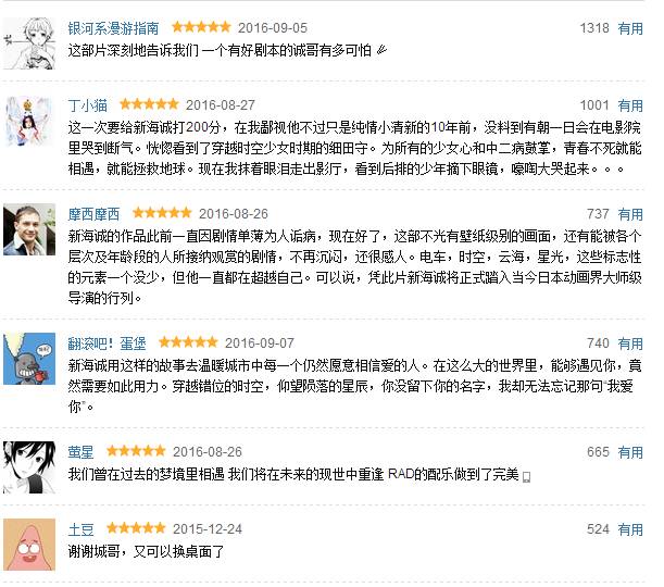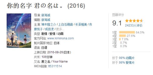 提及新海诚,必然会想起2007年上映的《秒速五厘米》,可以说这是迄今为止他最受欢迎的作品了。但是其他不管是《星之声》还是《云之彼端,约定的地方》或者是《追逐繁星的孩子》以及《言叶之庭》,这些作品始终都是萦绕着一种没有来由的,唯美而哀伤的丧失感,故事零碎、结构松散等弱点也暴露出来,但8月份上映的《你的名字》却突破了这一桎梏,因此在豆瓣评分上也获得了9.1的高分。从某种意义上,这部动画电影是集新海诚大成的作品,不少粉丝都表示看到了《星之声》、《秒速五厘米》、《言叶之庭》的影子。虽然还是新海诚风格的作品,不过作画监督则请来了吉卜力的安藤雅司,人设是《那朵花》的田中将贺。不仅有让人轻松欢笑的场面,也有令人震惊的主线剧情和让人不禁落泪的情感描写,弥补了新海诚近年来作品剧本虚弱的小缺陷。正如豆瓣上那位朋友所说的那样,拥有了一个好剧本的诚哥是多么的可怕。从1999年《她和她的猫》开始,在经历了那么多好与坏的尝试之后,新海诚终于像他每一部动画里的男主角一样走到了人性深渊的最底层,生活在现代都市社会的我们,即使被赋予了一切即时沟通的可能性,却仍要面对日益凸显的爱无能与孤独感,唯一的自我救赎之路恰是一段命运感的爱情,这就是新海诚给出的答案。新海诚曾说,希望动画对观众而言是像创可贴一般的存在;受伤时可以用它加速伤口愈合,复原后便撕下它、无需留恋。