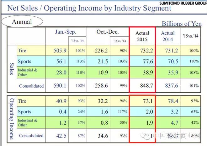2016年2月22日,日前来自全球领先的轮胎制造商住友橡胶工业有限公司(SRI)发布 了其2015年的财务报告;该报告显示其2015年度销售收入70.1亿美元(约463亿人民币),增加了1.3%,而营业利润减少10.6%,同时其净利润达到了4.614亿美元,增高了4.6%。而公司表示这源自于和固特异全球的合作终止。