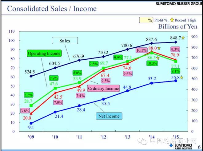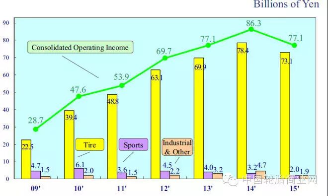 在整个财务年度里,该公司的轮胎业务的营业利润同比下降6.8%为6.042亿美元,百销售收入为60.5亿美元,增加了0.1%。住友表示在海外的各个市场均实现了增长,这得益于更多的销量和较好的日元汇率。不过日本的市场却遇到挑战。