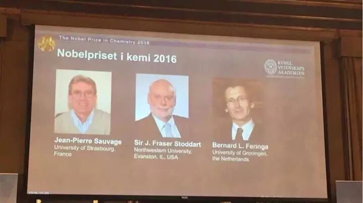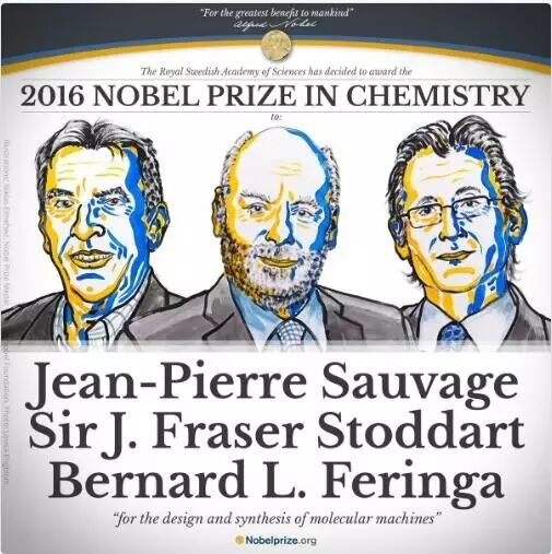 2016年诺贝尔化学奖授予了法国科学家让-皮埃尔·索维奇(Jean-Pierre Sauvage),美国科学家J.弗雷泽·斯托达特(J.Fraser Stoddart)和荷兰科学家伯纳德·L·费林加(Bernard L. Feringa)。因为在“分子机器的设计和合成”上的卓越贡献——“发明了行动可控、在给予能源后可执行任务的分子机器”,他们联手摘得今年诺贝尔化学奖桂冠。这些机器可谓是“最小机器”,只有人类头发的千分之一大小。