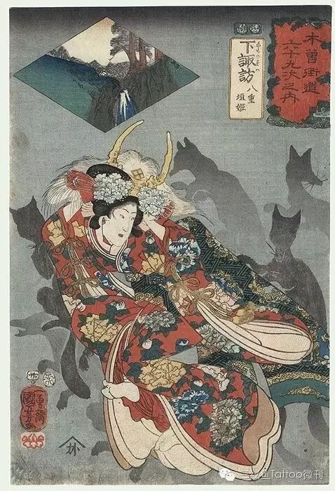 在亚洲和世界艺术中,它呈现出特异的色调与丰姿,历经三百余年,影响深及欧亚各地,十九世纪欧洲从古典主义到印象主义诸流派大师也无不受到此种画风的启发,因此,浮世绘具有很高的艺术价值。浮世绘的艺术,初期原为浮世绘,即画家们用笔墨色彩所作的绘画,而非木刻印制的绘画。的浮世绘,盛行于京都和大阪,这个画派开始是带有装饰性的。它为华贵的建筑作壁画,装饰室内的屏风。在绘画的内容上,有浓郁的本土气息,有四季风景、各地名胜,尤其善于表现女性美,有很高的写实技巧,为社会所欣赏。这些大和绘师的技术成就,代代相传,遂为其后的浮世绘艺术,开导了先路。 歌川国芳,日本江户时代人,是浮世绘歌川派晚期的大师之一。他出身丝绸染坊家庭,本名井草孙三郎,幼名芳三郎。在帮助父亲料理生意的同时对艺术产生兴趣。先从师歌川国直,后来为版画大师歌川丰国所看中,于1811年被收为弟子,1814年出师并取艺名歌川国芳。和歌川派其他画家一样,他开始是创作戯画,但生意不佳,几年后不得不以修理榻榻米为生。后来偶遇歌川国贞,觉得自己的才能其实高过对方,于是刻苦努力,画出的一些武者三联画得到好评。1827年开始创作著名的水浒传豪杰百八人系列。30年代早期工于山水、40年代创作了大量的美人绘和武者絵。歌川国芳还因为画猫而著名,经常在画面角落里带上猫。据弟子说他爱猫到作坊里到处养猫的地步。