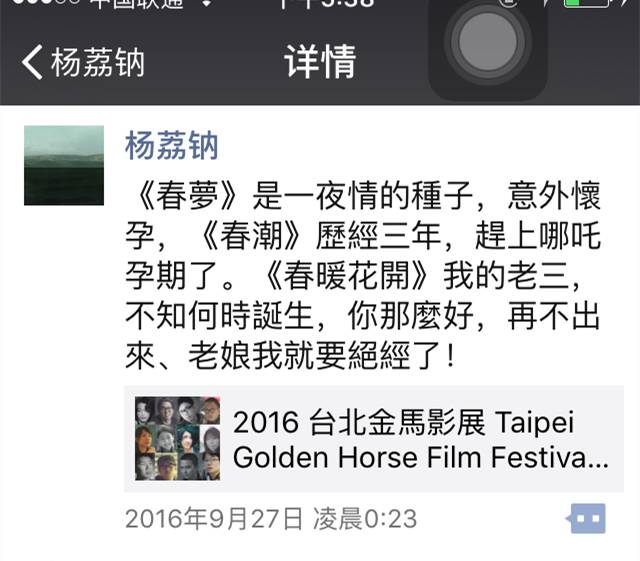 前天,手册君从杨荔钠导演朋友圈得知她的创投项目《春潮》入围了今年台北金马创投名单。
