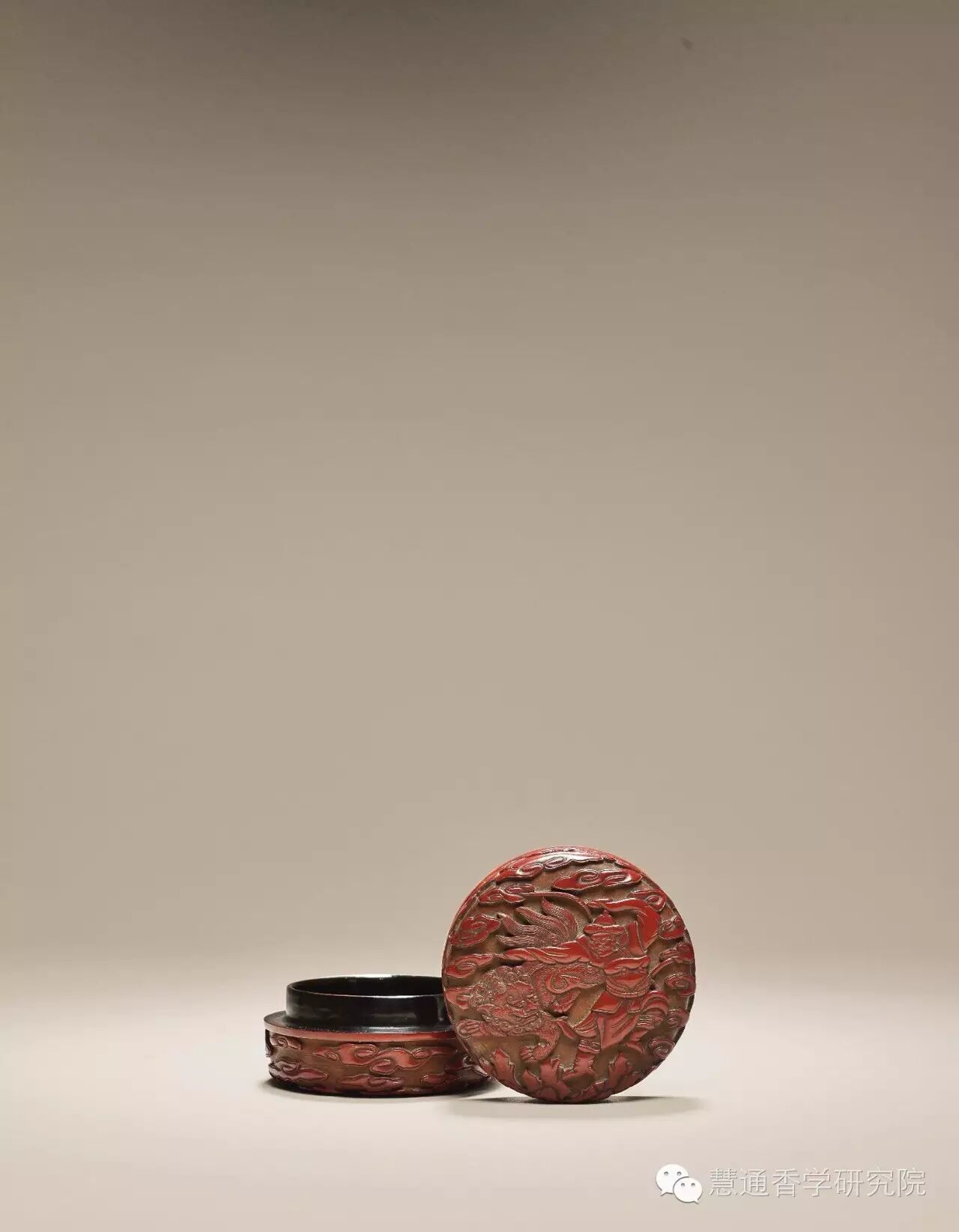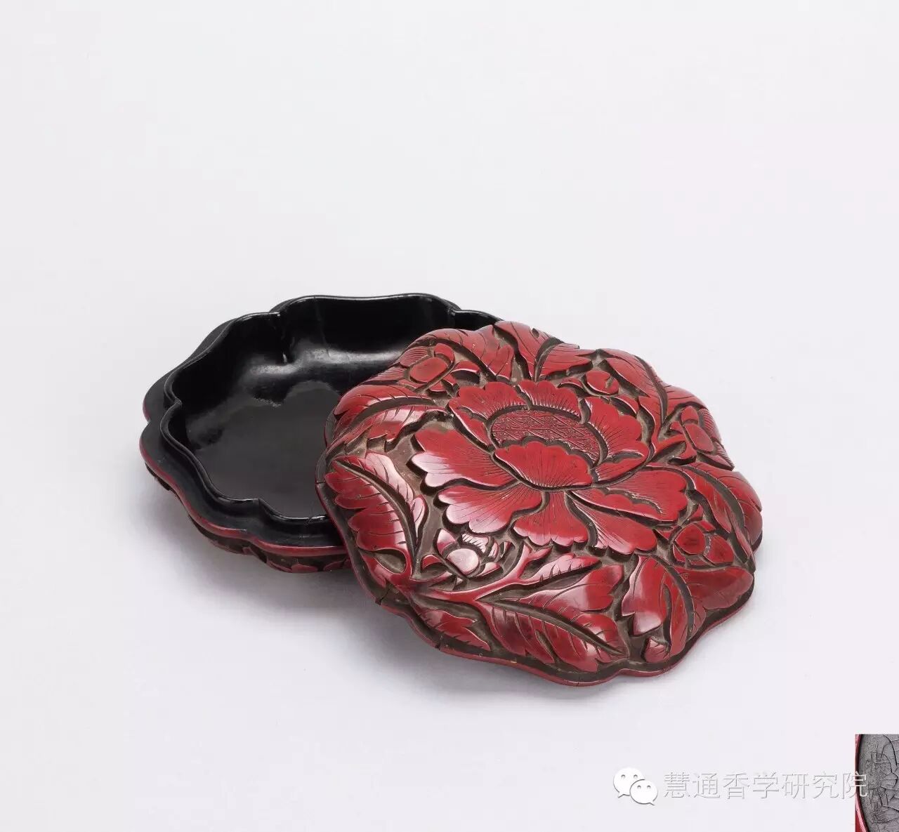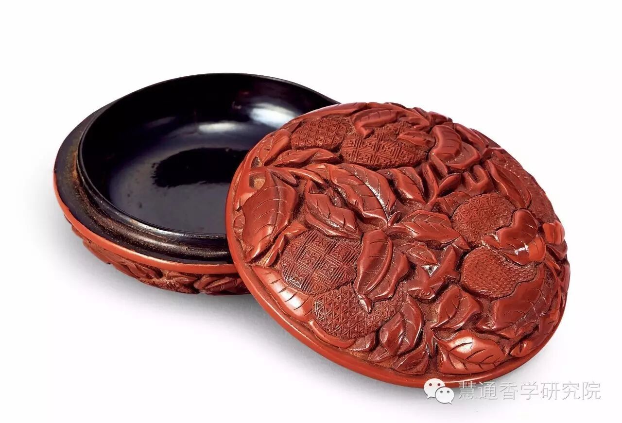明代文震亨《长物志》论香合:“宋剔盒色如珊瑚者为上。古有一剑环、二花草、三人物之说,又有五色漆胎,刻法深浅,随妆露色,如红花绿叶、黄心黑石者次之。”