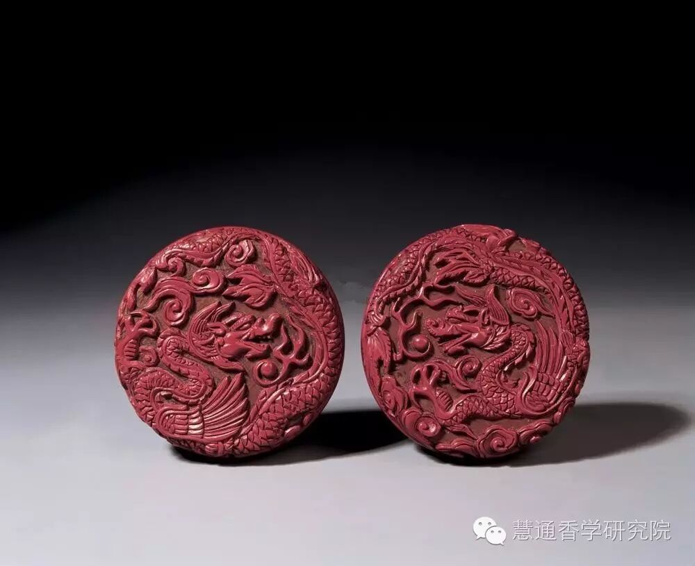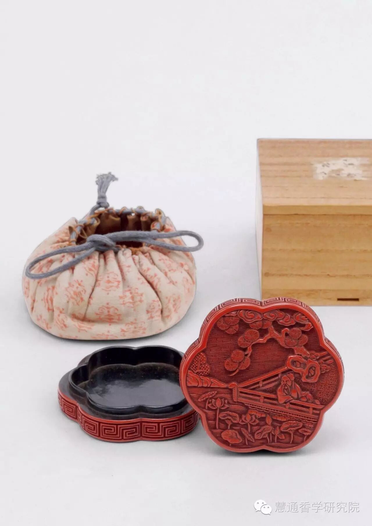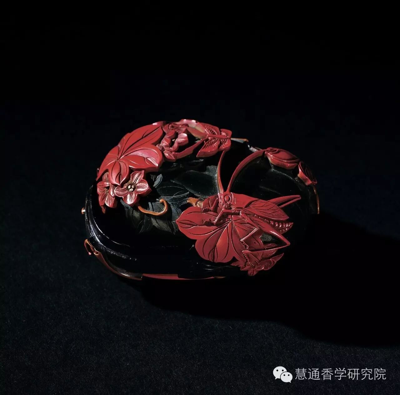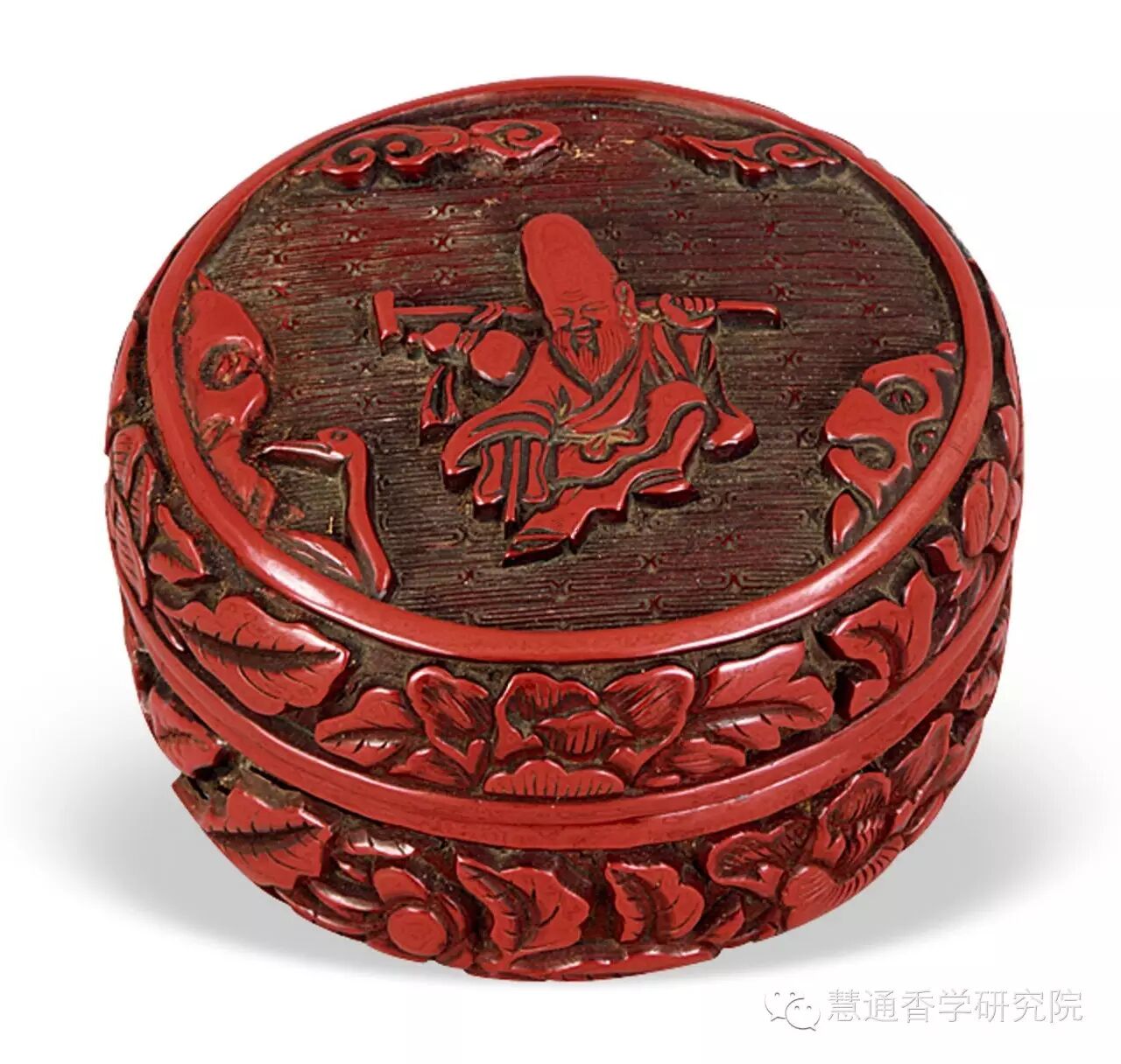 明代文震亨《长物志》论香合:“宋剔盒色如珊瑚者为上。古有一剑环、二花草、三人物之说,又有五色漆胎,刻法深浅,随妆露色,如红花绿叶、黄心黑石者次之。”